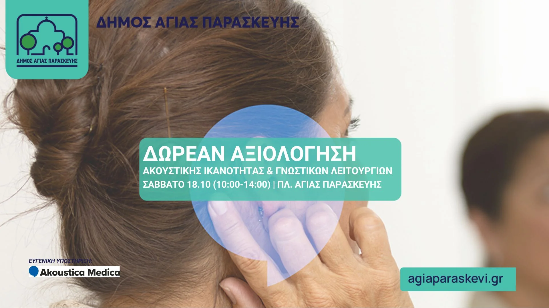 Τη διαρκή μέριμνα για την υγεία και ποιότητα ζωής των πολιτών επιδιώκει ο Δήμος Αγίας Παρασκευής, διοργανώνοντας δωρεάν ελέγχους ακουστικής ικανότητας.