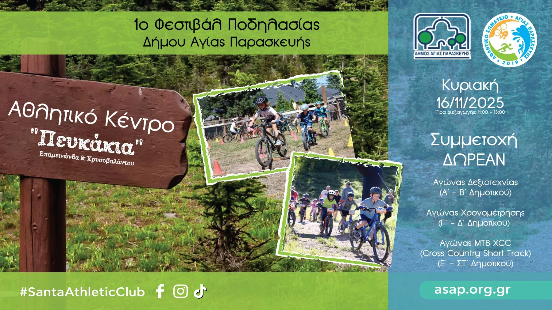 Το «1ο Φεστιβάλ Ποδηλασίας Δήμου Αγίας Παρασκευής» διοργανώνει ο Δήμος της πόλης σε συνεργασία με το Αθλητικό Σωματείο του προαστίου (Α.Σ.Α.Π), την Κυριακή 16 Νοεμβρίου στο Πάρκο Πευκακίων.