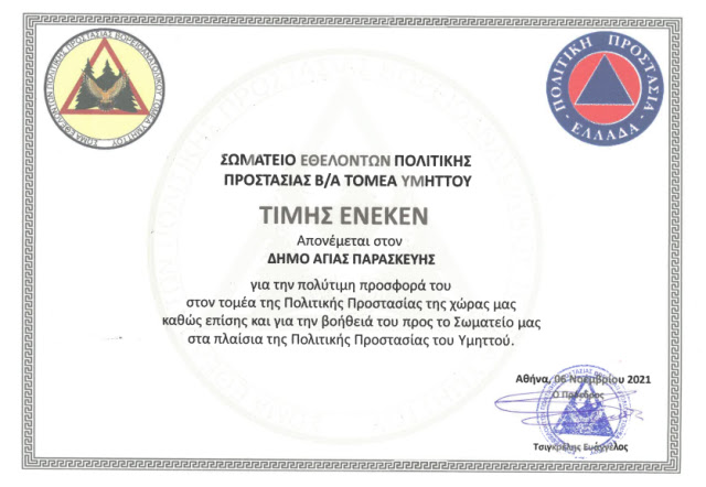 Μια συμβολική αναγνώριση στο απαιτητικό έργο της Πολιτικής Προστασίας απέσπασε από το Σωματείο Εθελοντών Πολιτικής Προστασίας Βορειοανατολικού Τομέα Υμηττού (ΣΕΠΠΒΑΤΥ) ο Δήμος Αγίας Παρασκευής. Η οργάνωση τον βράβευσε λόγω της προσφοράς του στο κομμάτι αυτό καθώς και για τη βοήθειά του προς τον σύλλογο, στο πλαίσιο της προφύλαξης του Υμηττού.