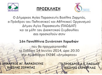 Το Σάββατο 14 Ιουνίου 2014 και ώρα 8.30 το βράδυ θα πραγματοποιηθεί η στο Αμφιθέατρο ΕΚΕΦΕ Δημόκριτος η 16η Πανελλήνια Συνάντηση Χορωδιών. Ο δήμαρχος Αγίας Παρασκευής, Βασίλης Ζορμπάς και ο πρόεδρος του Πολιτιστικού και Αθλητικού Οργανισμού του Δήμου προσκαλούν τους δημότες να το παρακολουθήσουν.