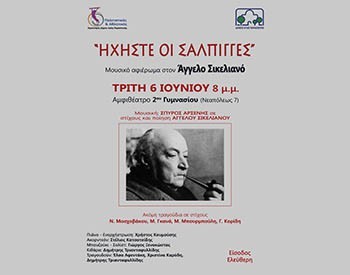 Συναυλία- αφιέρωμα στον μεγάλο μας ποιητή Άγγελο Σικελιανό, με τίτλο «Ηχήστε οι σάλπιγγες» και μουσική Σπύρου Αρσένη, διοργανώνουν ο Δήμος Αγίας Παρασκευής και ο Πολιτιστικός και Αθλητικός Οργανισμός του Δήμου-ΠΑΟΔΑΠ την Τρίτη 6/6, στις 8:00μμ, στο θέατρο του 2ου Γυμνασίου (Νεαπόλεως 7).