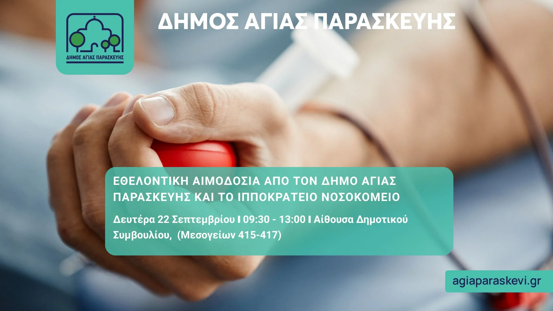 Σε συνεργασία με το Ιπποκράτειο Νοσοκομείο, ο Δήμος Αγίας Παρασκευής οργανώνει την 87η -κατά σειρά- εθελοντική του αιμοδοσία.
