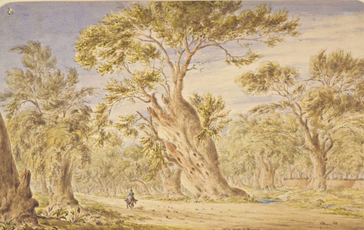 Η τρίτη υδατογραφία του Σκην, πάλι με τον τίτλο «Olive grove of Marousi» (Ελαιώνας του Αμαρουσίου), σήμερα στο Βρετανικό Μουσείο στο Λονδίνο, φιλοτεχνήθηκε το 1838 και διαφέρει από τις δύο προηγούμενες, καθώς απεικονίζει μια διαφορετική άποψη του ελαιώνα. Το τοπίο περιλαμβάνει έναν χωματόδρομο, υπό τον ίσκιο μιας θεόρατης ελιάς με παχύ κορμό, ενώ γύρω στέκουν άλλες συνθέτοντας ένα πυκνό δάσος. Ένα μικρό ρυάκι με νερό και ο μανδρότοιχος μιας ιδιοκτησίας ποικίλλουν την εικόνα. Ο ζωγράφος τοποθέτησε και εδώ έναν μικροσκοπικό χωρικό να διασχίζει τον δρόμο με το γαϊδουράκι του, θέλοντας έτσι να τονίσει το μέγεθος των δέντρων.