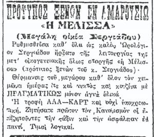 Το 1924 ο Σεργιάδης ξεκίνησε τη λειτουργία κανονικού ξενοδοχείου, το οποίο ονόμασε «Ξενών η Μέλισσα». Στην εφημερίδα «Εμπρός», στις 11 Οκτωβρίου, υπάρχει σχετική διαφημιστική καταχώρηση, που υπόσχεται ότι «ρυθμισθείσα καθ’ όλα ως καλόν ωρολόγιον Σεργιάδου», η Μέλισσα προσφέρει θέρμανση όλο τον χειμώνα και κουζίνα α λα καρτ, με αγνά υλικά. Το 1927 η Μέλισσα είχε σύμφωνα με τον ιδιοκτήτη της δυναμικότητα 19 δωματίων, ενώ η ζήτηση έφτασε εκείνο τον χρόνο τα 72, από την Αθήνα, την επαρχία και ομογενείς της Αιγύπτου. Εντούτοις, τον Νοέμβριο του ίδιου έτους ο Σεργιάδης ανακοίνωσε το κλείσιμο του ξενοδοχείου, καθώς δεν μπορούσε να ανταπεξέλθει στην πολύ υψηλή κρατική φορολογία, που το είχε κατατάξει στα καταλύματα πολυτελείας, αλλά και στους φόρους που του είχε επιβάλει η Κοινότητα Αμαρουσίου. Όπως μάλιστα έγραφε στην «Κηφισσιά», θα πουλούσε και το ρολόι για να ανταπεξέλθει στα προς το ζην.