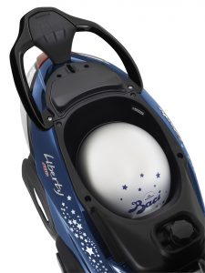 Έτσι το Liberty ντύθηκε με τα κλασσικά χρώματα και γραφικά των Baci: το κομψό βαθύ μπλε στολισμένο με αστέρια ντύνει το μπροστινό μέρος και τα πλαϊνά, ενώ το διάσημο λογότυπο υπογράφει στην ποδιά. Η σκουρόχρωμη δερμάτινη σέλα, από την άλλη θυμίζει τα χρώματα της επικάλυψης με σοκολάτα Luisa Dark, που ανέκαθεν ξεχώριζαν το αριστούργημα του οίκου Perugina.