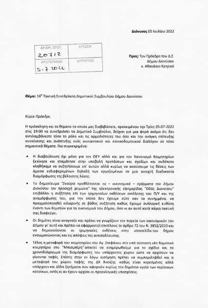 Στην επιστολή αυτή ανέφεραν τους λόγους της αποχής τους, σημειώνοντας μεταξύ άλλων ότι «δεν αντιλαμβάνεστε τόσο το ρόλο και τις αρμοδιότητες του Δημοτικού Συμβουλίου όσο και την ανάγκη επίτευξης συναίνεσης και ανάπτυξης ενός ουσιαστικού και εποικοδομητικού διαλόγου σε τόσο σημαντικά θέματα». Τα θέματα στα οποία αναφέρονται είναι: η διαβούλευση για τον ΟΕΥ και τον Κανονισμό Κοιμητηρίων, τα οικονομικά του Δήμου για τα οποία ζητούν «σε βάθος συζήτηση», η μεταφορά του κοιμητηρίου του Αγ. Στεφάνου και του χώρου ταφής της ΔΚ Άνοιξης, σημειώνοντας για όλα ότι πρέπει να προηγηθεί ουσιαστική διαβούλευση και ενημέρωση για να μην είναι «διακοσμητικός» ο ρόλος της αντιπολίτευσης.
