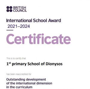 Οι δράσεις αξιολογήθηκαν από το British Council και επιβραβεύτηκαν στις αρχές Οκτωβρίου 2021 με την επαναδιαπίστευση του 1ου Δημοτικού Διονύσου ως International School για την τριετία 2021-2024.