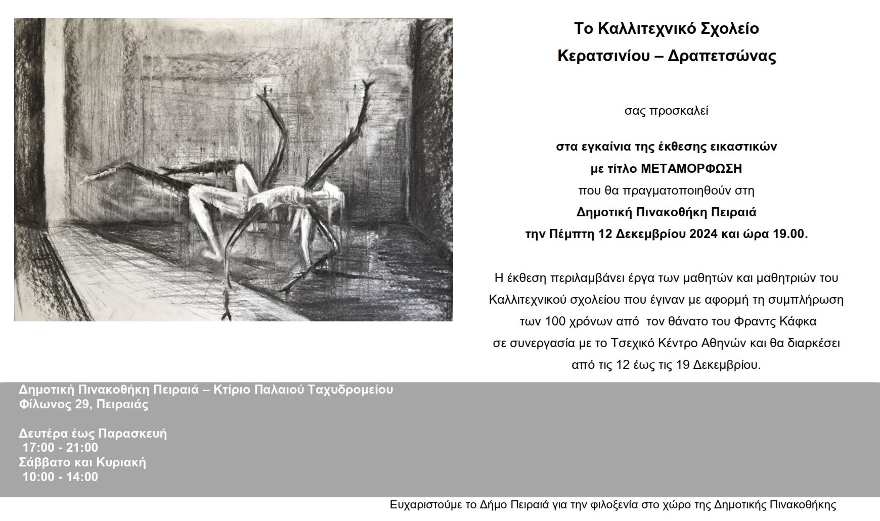 Το Καλλιτεχνικό Σχολείο Κερατσινίου-Δραπετσώνας διοργανώνει έκθεση εικαστικών έργων με τίτλο «Μεταμόρφωση», στο πλαίσιο της συνεργασίας του με το Τσεχικό Κέντρο στην Αθήνα (τμήμα της Πρεσβείας της Τσεχικής Δημοκρατίας) και με αφετηρία τον φετινό εορτασμό του έτους Φραντς Κάφκα. Τα εγκαίνια θα πραγματοποιηθούν την Πέμπτη 12 Δεκεμβρίου 2024 ώρα 19.00 στη Δημοτική Πινακοθήκη Πειραιά. Η Έκθεση, η οποία περιλαμβάνει 60 έργα των μαθητών/ριών της εικαστικής κατεύθυνσης, θα διαρκέσει έως τις 19 Δεκεμβρίου.