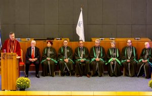 Η αναγόρευση του Τιμώμενου σε επίτιμο διδάκτορα, η περιένδυση και η επίδοση τιμητικής πλακέτας στον δρ. Γεώργιο Β. Αποστολόπουλο, πραγματοποιήθηκε από τον πρύτανη του Διεθνούς Πανεπιστημίου της Ελλάδος, καθηγητή Σταμάτη Αγγελόπουλο.
