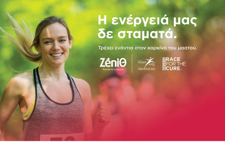 Για δεύτερη συνεχή χρονιά, η ZeniΘ υποστήριξε το Greece Race for the Cure®, μία από τις κορυφαίες αθλητικές διοργανώσεις για κοινωνικό σκοπό στην Ευρώπη, με στόχο την πρόληψη και ευαισθητοποίηση για τον καρκίνο του μαστού. Ο συμβολικός αγώνας που πραγματοποιήθηκε στις 27 & 28 Σεπτεμβρίου στο Ζάππειο Μέγαρο, διοργανώθηκε από τον Πανελλήνιο Σύλλογο Γυναικών με Καρκίνο Μαστού «Άλμα Ζωής», σε συνεργασία με τον Οργανισμό Πολιτισμού Αθλητισμού και Νεολαίας του Δήμου Αθηναίων (ΟΠΑΝΔΑ) και με την υποστήριξη του Think Pink Europe®.