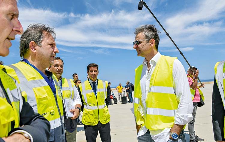 Καραμανλής με τον γ.γ. Υποδομών Γιώργο Καραγιάννη. Στο πλαίσιο της επίσκεψής του στο νησί για το «άνοιγμα» του ελληνικού τουρισμού, ο πρωθυπουργός ενημερώθηκε την Κυριακή για την πορεία των εργασιών στο νέο αεροδρόμιο από τον CEO της Intrakat Πέτρο Σουρέτη, τον CFO Βαγγέλη Μπαλτά και τον COO Fraport Greece Ηλία Μαραγκάκη.