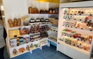 Ο χώρος πλαισιώνεται από πλαϊνά ψυγεία και προθήκες γαλακτοκομικών, μαζί με συσκευασμένα είδη, διαμορφώνοντας ένα μικρό αλλά πλήρες παντοπωλείο-deli.