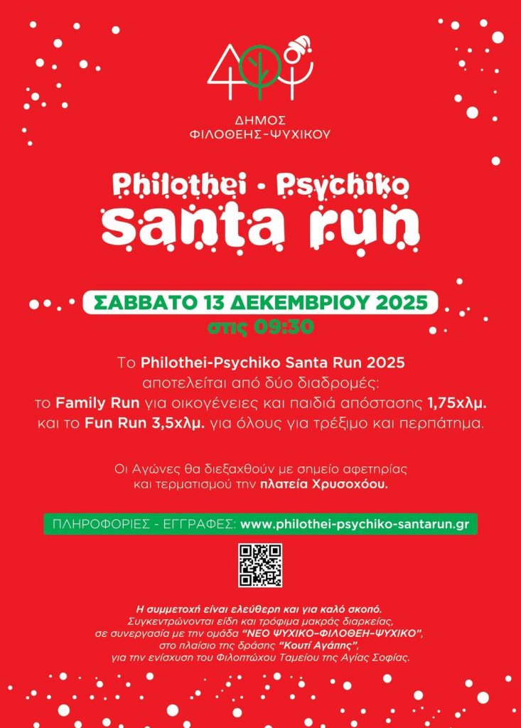Το Σάββατο 13 Δεκεμβρίου, η πόλη θα ντυθεί στα «κόκκινα», καθώς οι δρόμοι της πόλης θα πλημμυρίσουν με δημότες και πολίτες του Δήμου Φιλοθέης – Ψυχικού αλλά και των γύρων δήμων, που φορώντας τα σκουφιά τους και τη στολή του Άγιου Βασίλη τρέχουν, περπατούν, γελούν και συμμετέχουν σε μια δράση που συνδυάζει γιορτινή ατμόσφαιρα και προσφορά.