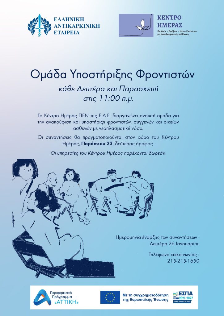 Συνεχίζονται οι συναντήσεις της ανοιχτής ομάδας υποστήριξης για συγγενείς, συνοδούς και φροντιστές ογκολογικών ασθενών που πραγματοποιεί το Κέντρο Ημέρας Παιδιών, Εφήβων και Νέων Ενηλίκων με Νεοπλασματικές Ασθένειες της Ελληνικής Αντικαρκινικής Εταιρείας, που διατήρεί Παράρτημα στον Δήμο Φιλοθέης-Ψυχικού.