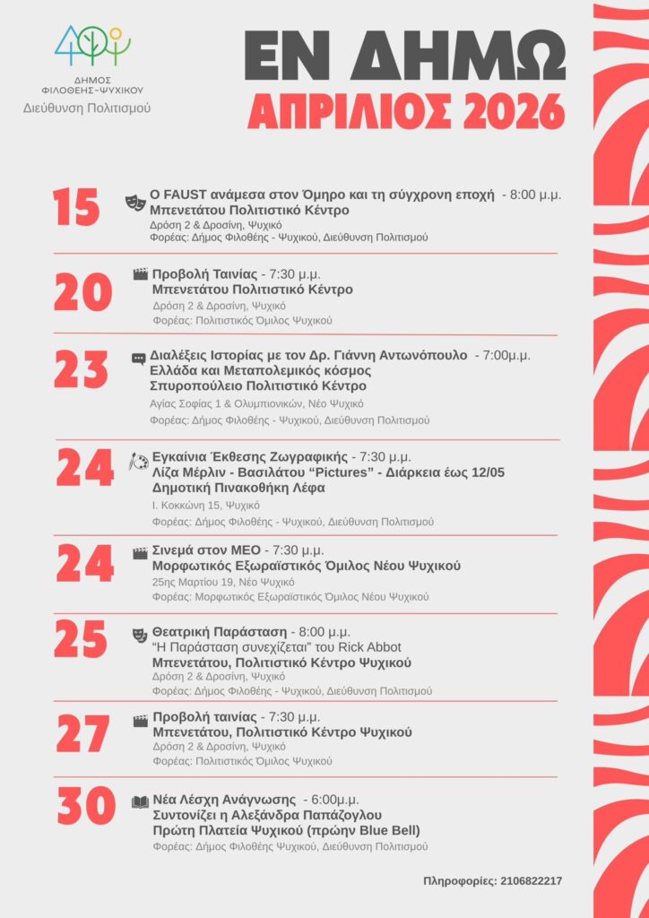 Ο Απρίλιος πρόκειται να είναι ένας μήνας αφιερωμένος στην τέχνη, την ιστορία και την αλληλεγγύη στον Δήμο Φιλοθέης – Ψυχικού, με ένα πλούσιο και πολυδιάστατο πρόγραμμα εκδηλώσεων.