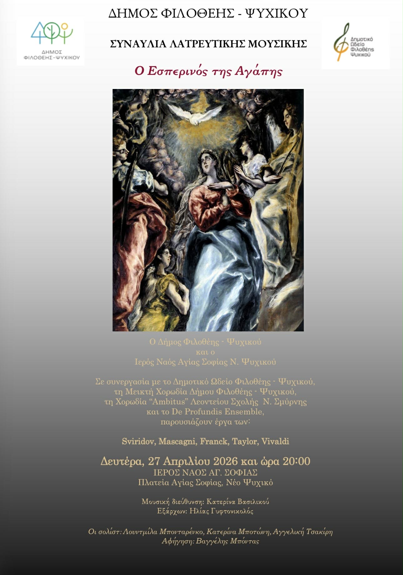 Μετά την αναβολή της λόγω δυσμενών καιρικών συνθηκών στις αρχές του μήνα, η συναυλία λατρευτικής μουσικής «Ο Εσπερινός της Αγάπης» επαναπρογραμματίζεται και θα πραγματοποιηθεί τη Δευτέρα 27 Απριλίου στις 20:00, στον Ιερό Ναό Αγίας Σοφίας Νέου Ψυχικού.
