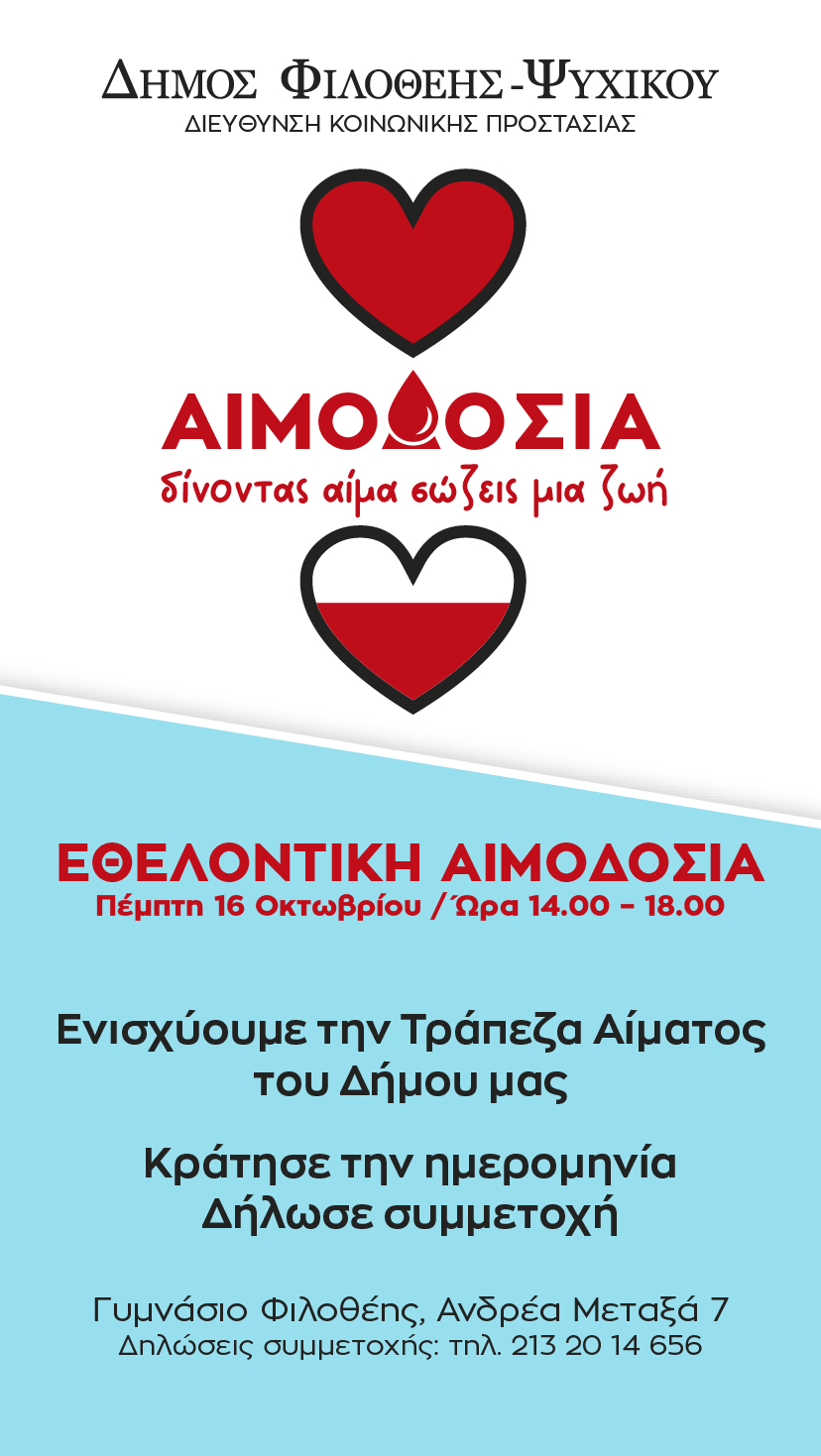Ο Δήμος Φιλοθέης-Ψυχικού προσκαλεί τους κατοίκους και τους πολίτες να συμμετάσχουν στην πρώτη Εθελοντική Αιμοδοσία του Φθινοπώρου, ενισχύοντας τη Δημοτική Τράπεζα Αίματος και στηρίζοντας όσους έχουν ανάγκη.
