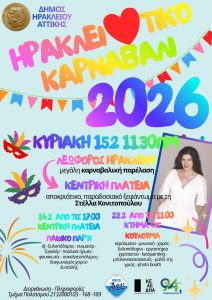 «Το Ηράκλειο φορά τα αποκριάτικά του και γεμίζει χαμόγελα, χρώματα και μουσικές. Μικροί και μεγάλοι, οικογένειες, φίλοι και παρέες, σας προσκαλούμε να ζήσετε από κοντά τις καρναβαλικές μας εκδηλώσεις, να συμμετάσχετε στην αποκριάτικη παρέλαση και να διασκεδάσετε στη μεγάλη γιορτή με μουσική που θα ακολουθήσει στην κεντρική πλατεία της πόλης.Ελάτε να γεμίσουμε τους δρόμους με κέφι, ρυθμό και αισιοδοξία, να χορέψουμε, να τραγουδήσουμε και να γιορτάσουμε όλοι μαζί.Η πόλη μας γιορτάζει – και αυτή η γιορτή είναι για όλες και όλους», το μήνυμα του δημάρχου Ηρακλείου Αττικής, Νίκου Μπάμπαλου.