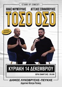 Την Κυριακή 14 Δεκεμβρίου, στις 20:00, στη σκηνή του Δημοτικού Θεάτρου Πεύκης θα ανέβει η παράσταση Stand Up Comedy «Τόσο Όσο», με τους Ηλία Φουντούλη και Άγγελο Σπηλιόπουλο.