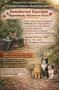 Δωρεάν εκπαιδευτικό σεμινάριο Περισυλλογής Αδέσποτων Γατών συνδιοργανώνει η εντεταλμένη δημοτική σύμβουλος Φιλοζωίας, Έλενα Χρονοπούλου, σε συνεργασία με εθελοντές φιλόζωους του Δήμου Κηφισιάς.
