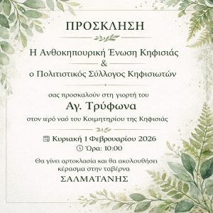 Ο Πολιτιστικός Σύλλογος των Κηφισιωτών σε συνεργασία με την Ανθοκηπουρική Ένωση Κηφισιάς, ένα από τα παλαιότερα σωματεία της πόλης, γιορτάζουν μαζί τον Άγιο Τρύφωνα, που θεωρείται ο προστάτης των γεωργών και των ανθοκηπουρών.