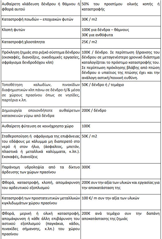 Όπως σημειώνεται στον Κανονισμό, για την παράβαση των κανόνων του επιβάλλονται συγκεκριμένα πρόστιμα, τα οποία είναι κατ’ ελάχιστον. Η επιβολή προστίμου ιδίως για τα δένδρα, πέρα από την κατ’ ελάχιστον τιμή συνδυάζεται και με κριτήρια όπως η σπανιότητα, η υγεία και η ηλικία του δένδρου.