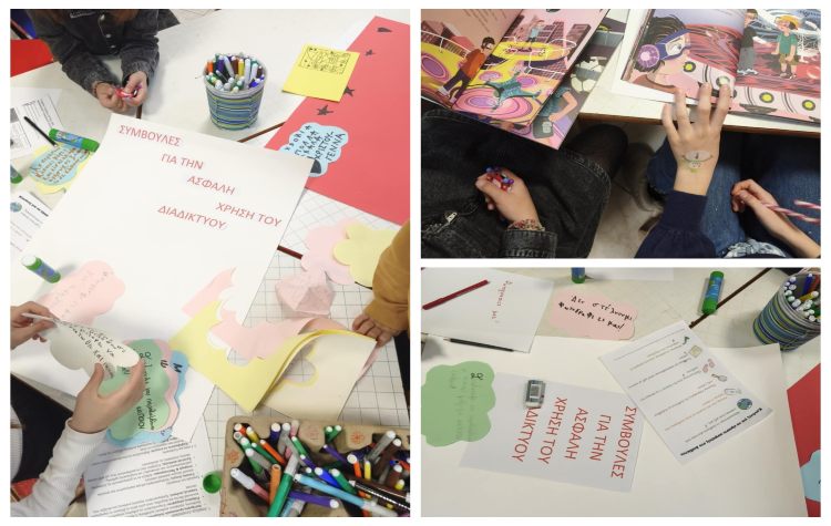 Κατόπιν οι νεαροί αναγνώστες, προχώρησαν άμεσα στη δημιουργία σχετικής αφίσας «Συμβουλές για την ασφαλή χρήση του διαδικτύου» για να ενημερώνονται και άλλα παιδιά που επισκέπτονται το χώρο της Δημοτικής Βιβλιοθήκης.