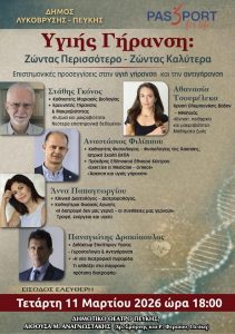 Σε συνεργασία με την ΑΜΚΕ «Passport for Life» διοργανώνει εσπερίδα με θέμα την υγεία, τη μακροζωία και την ποιοτική γήρανση, την Τετάρτη 11 Μαρτίου στις 18:00, στην Αίθουσα «Μ. Αναγνωστάκης» στο Δημοτικό Θέατρο Πεύκης (ισόγειο).