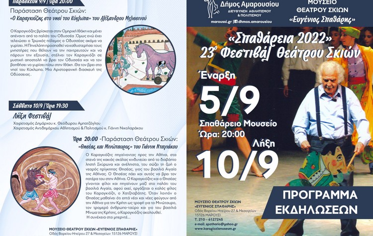Μία έκπληξη περίμενε τους μικρούς και μεγάλους φίλους του Καραγκιόζη και του Θεάτρου Σκιών που γέμισαν τον αύλειο χώρο του Μουσείου «Ευγένιος Σπαθάρης» (Δευτέρα 5 Σεπτεμβρίου) κατά την έναρξη του 23ου Φεστιβάλ Θεάτρου Σκιών του Δήμου Αμαρουσίου, «ΣΠΑΘΑΡΕΙΑ 2022» με τίτλο: «Ο Καραγκιόζης στην Ελληνική Μυθολογία». Ειδικό μουσικοχορευτικό πρόγραμμα προηγήθηκε της εναρκτήριας παράστασης του φετινού φεστιβάλ, δημιουργώντας μία ατμόσφαιρα γιορτής, συνώνυμης του λαϊκού ήρωα Καραγκιόζη.