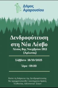 Ο Δήμος Αμαρουσίου διοργανώνει δενδροφύτευση στο Άλσος 8ης Νοεμβρίου 1912 (Αρίωνας) το Σάββατο 18 Οκτωβρίου 2025, ώρα 09:00.