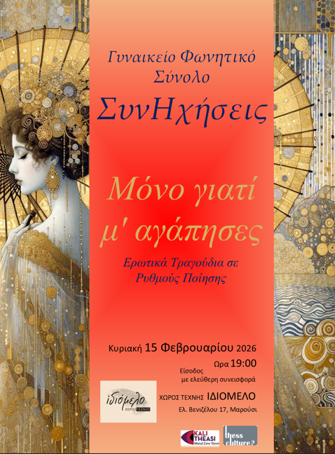 Στις 15 Φεβρουαρίου το βράδυ, ο όμορφος χώρος του ‘’Ιδιόμελου’’ στο Μαρούσι θα φιλοξενήσει μια μοναδική συναυλία αφιερωμένη στην αγάπη και στον έρωτα, όπως εκφράζεται μέσα από συνθέσεις μιας ευρείας χρονικής περιόδου, από την εποχή του μπαρόκ μέχρι τις σύγχρονες δημιουργίες γνωστών συνθετών (Purcell, Brahms, Mendelsohn, Οffenbach, Orff, Ζώρας, Θεοδωράκης, Κουρουπός, Κριτσωτάκης, Presley, Lennon-McCartney) πλαισιωμένες από την απαγγελία αποσπασμάτων σπουδαίων ποιητών, όπως Καβάφης, Πολυδούρη, Heine, Cummings, Lorca.