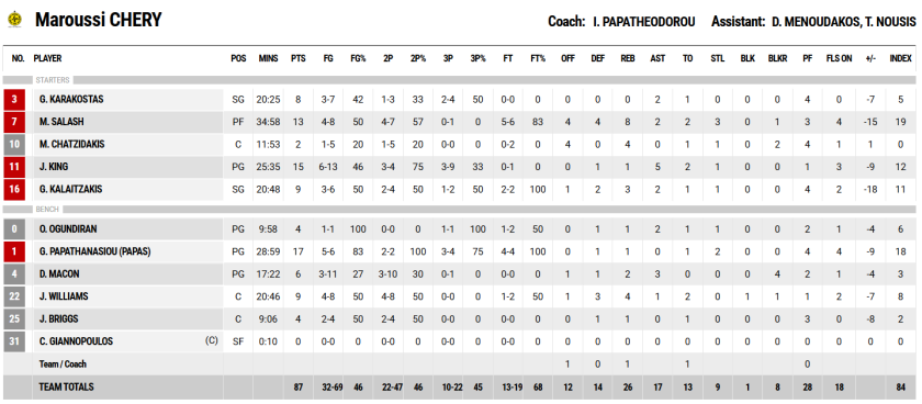 Πρώτος σκόρερ του Αμαρουσίου στο ντεμπούτο του ήταν ο Τζορτζ Πάπας (17π.), ενώ διψήφιο αριθμό πόντων είχαν και οι Τζόρνταν Κινγκ (15π., 5ασ.), Μαξίμ Σαλάς (13π., 8ρ.). Ντεμπούτο με το Μαρούσι έκανε και ο Τζόρνταν Ογκουντίραν (4π.).
