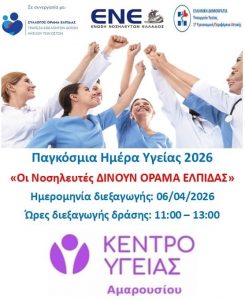 Στο πλαίσιο της Παγκόσμιας Ημέρας Υγείας 2026, το Κέντρο Υγείας Αμαρουσίου σε συνεργασία με την Ένωση Νοσηλευτών Ελλάδος, την 1η Υγειονομική Περιφέρεια Αττικής και τον Σύλλογο «Όραμα Ελπίδας», διοργανώνουν την δράση «Οι Νοσηλευτές Δίνουν Όραμα Ελπίδας».