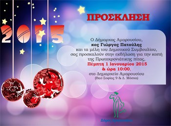 Ο δήμαρχος Γιώργος Πατούλης και τα μέλη του Δημοτικού Συμβουλίου Αμαρουσίου καλωσορίζουν το Νέο Έτος στην εκδήλωση για την κοπή της Πρωτοχρονιάτικης πίτας του Δήμου που θα πραγματοποιηθεί την Πέμπτη 1η Ιανουαρίου 2014 και ώρα 10 π.μ. Η πρωτοχρονιάτικη εκδήλωση θα πραγματοποιηθεί στην αίθουσα του Δημοτικού Συμβουλίου στο Δημαρχείο Αμαρουσίου (Βασ. Σοφίας 9 & Δημ. Μόσχα).