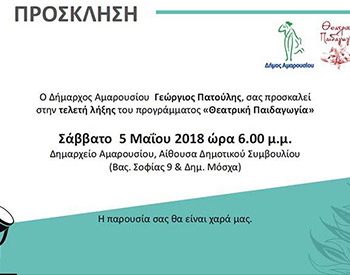 Ο δήμαρχος Γιώργος Πατούλης προσκαλεί το κοινό στην τελετή λήξης του προγράμματος το Σάββατο 5 Μαΐου 2018 και ώρα 18:00 στο Δημαρχείο Αμαρουσίου – αίθουσα Δημοτικού Συμβουλίου, «μία εκδήλωση για να συγχαρούμε τους νέους της πόλης μας για τη συμμετοχή τους σε αυτή την εμπνευσμένη και δημιουργική “θεατρική συνάντηση”».