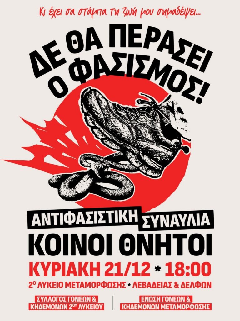 Mεγάλη αντιφασιστική συναυλία με το συγκρότημα «Κοινοί Θνητοί» διοργανώνουν η Ένωση Γονέων και Κηδεμόνων Μεταμόρφωσης και ο Σύλλογος Γονέων και Κηδεμόνων του 2ου Λυκείου Μεταμόρφωσης.
