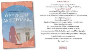 Η Δημοτική Βιβλιοθήκη Μεταμόρφωσης, σε συνεργασία με τις εκδόσεις Εύμαρος, διοργανώνει τη Δευτέρα 20 Οκτωβρίου, στις 19.00 το απόγευμα, την παρουσίαση του βιβλίου της Ελένη Μυτηλινάκη, με τίτλο «Ο κύριος Μ. δεν πρόλαβε».