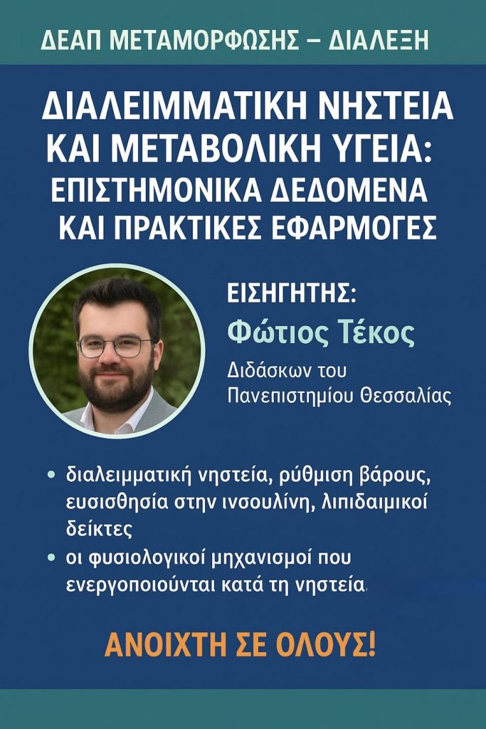 Χαρακτηριστικά, για τη διάλεξη, αναφέρει: «Η ενότητα εστιάζει στη διαλειμματική νηστεία (intermittent fasting) και στη συμβολή της στη βελτίωση της μεταβολικής υγείας. Θα παρουσιαστούν οι βασικές αρχές της, οι κυριότεροι τύποι, καθώς και τα σύγχρονα επιστημονικά δεδομένα γύρω από τη ρύθμιση του βάρους, την ευαισθησία στην ινσουλίνη, τους λιπιδαιμικούς δείκτες και το οξειδοαναγωγικό προφίλ. Οι συμμετέχοντες θα αποκτήσουν θεωρητική και πρακτική κατανόηση των φυσιολογικών μηχανισμών που ενεργοποιούνται κατά τη νηστεία, όπως η αυτοφαγία, και θα συζητηθούν πρακτικά παραδείγματα εφαρμογής στην καθημερινότητα. Η θεματική είναι ιδανική για κάθε πολίτη που ενδιαφέρεται να κατανοήσει πώς ο τρόπος ζωής μπορεί να επηρεάσει θετικά τη μεταβολική του υγεία, την ενέργεια και τη μακροχρόνια ευεξία».