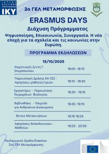Στο πλαίσιο της μεγάλης ευρωπαϊκής γιορτής των Erasmus Days, μέσα από την υλοποίηση του εγκεκριμένου σχεδίου ΚΑ-122, το 2ο Γενικό Λύκειο Μεταμόρφωσης διοργανώνει μία εκδήλωση διάχυσης του προγράμματος Erasmus+ με τίτλο: «Ψηφιοποίηση, Επικοινωνία, Συνεργασία – Η νέα εποχή για τα σχολεία και τις κοινωνίες στην Ευρώπη».