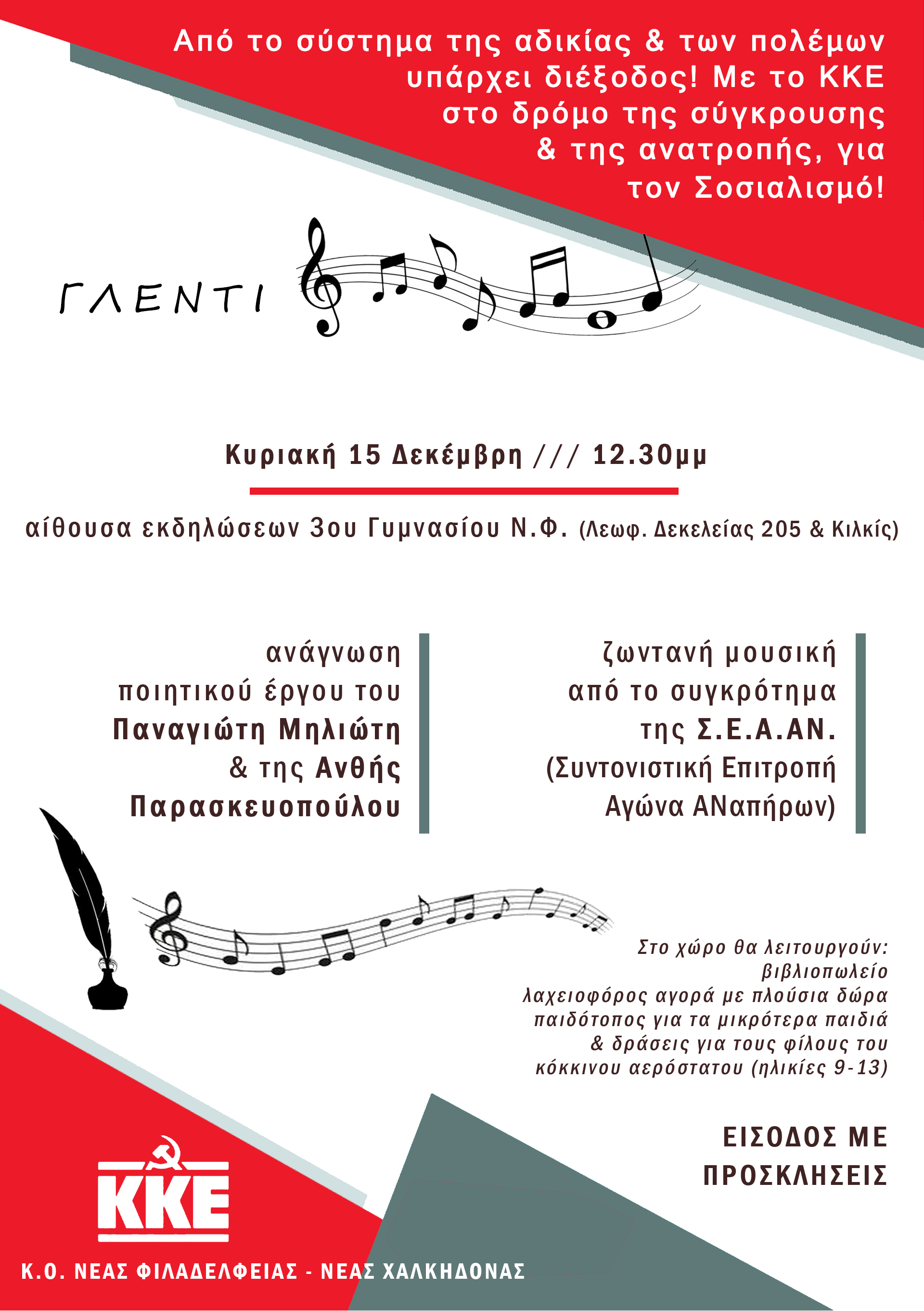 Η κομματική οργάνωση Νέας Φιλαδέλφειας – Νέας Χαλκηδόνας του ΚΚΕ διοργανώνει γλέντι την Κυριακή 15 Δεκέμβρη και ώρα 12.30 μ.μ. στην αίθουσα εκδηλώσεων 3ου Γυμνασίου Νέας Φιλαδέλφειας (Λεωφόρος Δεκελείας 205 & Κιλκίς), όπου θα γίνει ανάγνωση του ποιητικού έργου του Παναγιώτη Μηλιώτη & της Ανθής Παρασκευοπούλου.