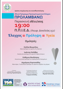 Ο Δήμος Νέας Φιλαδέλφειας – Νέας Χαλκηδόνας, στο πλαίσιο των δράσεων του για την προαγωγή της δημόσιας υγείας, σε συνεργασία με το Κέντρο Υγείας Νέας Φιλαδέλφειας, διοργανώνει δράση ενημέρωσης για το Εθνικό Πρόγραμμα Προσυμπτωματικού Ελέγχου «Προλαμβάνω», η οποία θα πραγματοποιηθεί στο Π.Π.Ι.Ε.Δ. (Λεωφ. Δεκελείας 152), την Παρασκευή 28 Νοεμβρίου και ώρα 19:00.