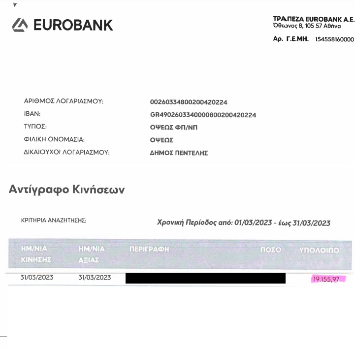 Και πώς θα μπορούσε να κάνει διαφορετικά, αφού το ταμείο του Δήμου Πεντέλης είναι άδειο. Μετά από σχετικό αίτημά μας, η Οικονομική Υπηρεσία μας απέστειλε τα αντίγραφα κίνησης τραπεζικών λογαριασμών με τα υπόλοιπα ταμειακών διαθεσίμων του Δήμου Πεντέλης στις 31/03/2023, από τα συνεργαζόμενα χρηματοπιστωτικά ιδρύματα. Η εικόνα που αντικρύσαμε είναι πολύ χειρότερη από αυτήν που περιμέναμε, καθώς η πραγματική ρευστότητα του Δήμου Πεντέλης φτάνει τις 401.934,02 ευρώ (382.778,05€ στην Τράπεζα της Ελλάδος και 19.155,97€ στη Eurobank). Το ποσό αυτό δεν μπορεί να καλύψει ούτε την μηνιαία μισθοδοσία των δημοτικών υπαλλήλων! Υπάρχουν επιπλέον 5.126.929,05 ευρώ στο Ταμείο Παρακαταθηκών και Δανείων, τα οποία φυλάσσονται ως κόρη οφθαλμού και αποτελούν το αποθεματικό του ανταποδοτικού τέλους 0,50€/τ.μ το οποίο βαρύνει μόνο τους κατοίκους των Μελισσίων για αγορά γης στα Μελίσσια, με βάση την απόφαση 308/2007 του Δημοτικού Συμβουλίου Μελισσίων.