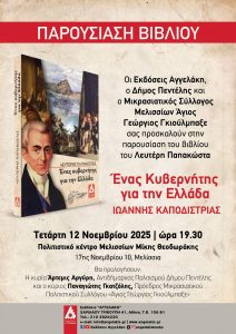 Οι Εκδόσεις Αγγελάκη, Ο Δήμος Πεντέλης και ο Μικρασιατικός Σύλλογος Μελισσίων Άγιος Γεώργιος Γκιούλμπαξε προσκαλούν το κοινό στην παρουσίαση του βιβλίου του Λευτέρη Παπακώστα:«Ένας Κυβερνήτης για την Ελλάδα ΙΩΑΝΝΗΣ ΚΑΠΟΔΙΣΤΡΙΑΣ».