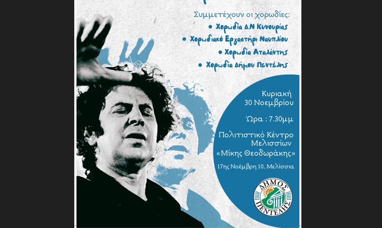 πλημμυρίζοντας, την Κυριακή 30 Νοεμβρίου και ώρα 19.00, το Πολιτιστικό Κέντρο Μελισσίων ‘Μίκης Θεοδωράκης’ με τον παλμό του στοιχείου της ελληνικότητας του εμβληματικού μουσουργού Μίκη Θεοδωράκη.