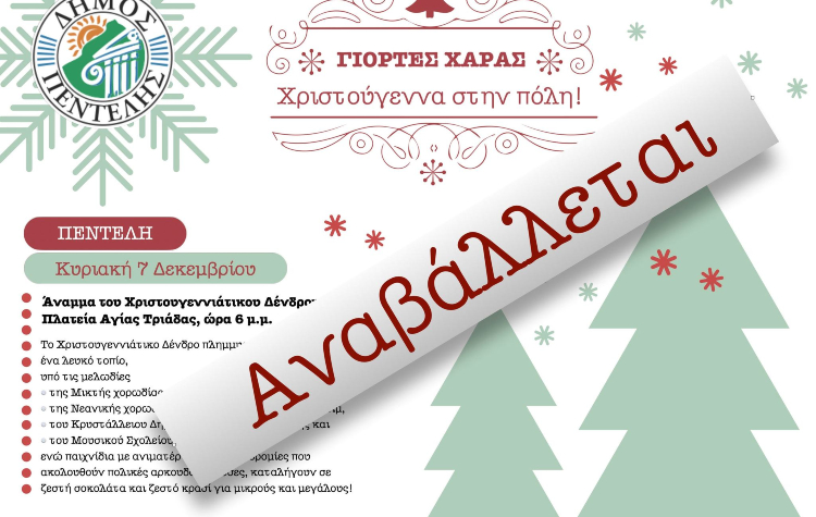 Όπως έγινε γνωστό, λόγω της βροχόπτωσης, το προγραμματισμένο για σήμερα Κυριακή 7/12 άναμμα του Χριστουγεννιάτικου δέντρου της Δ.Κ Πεντέλης αναβάλλεται.