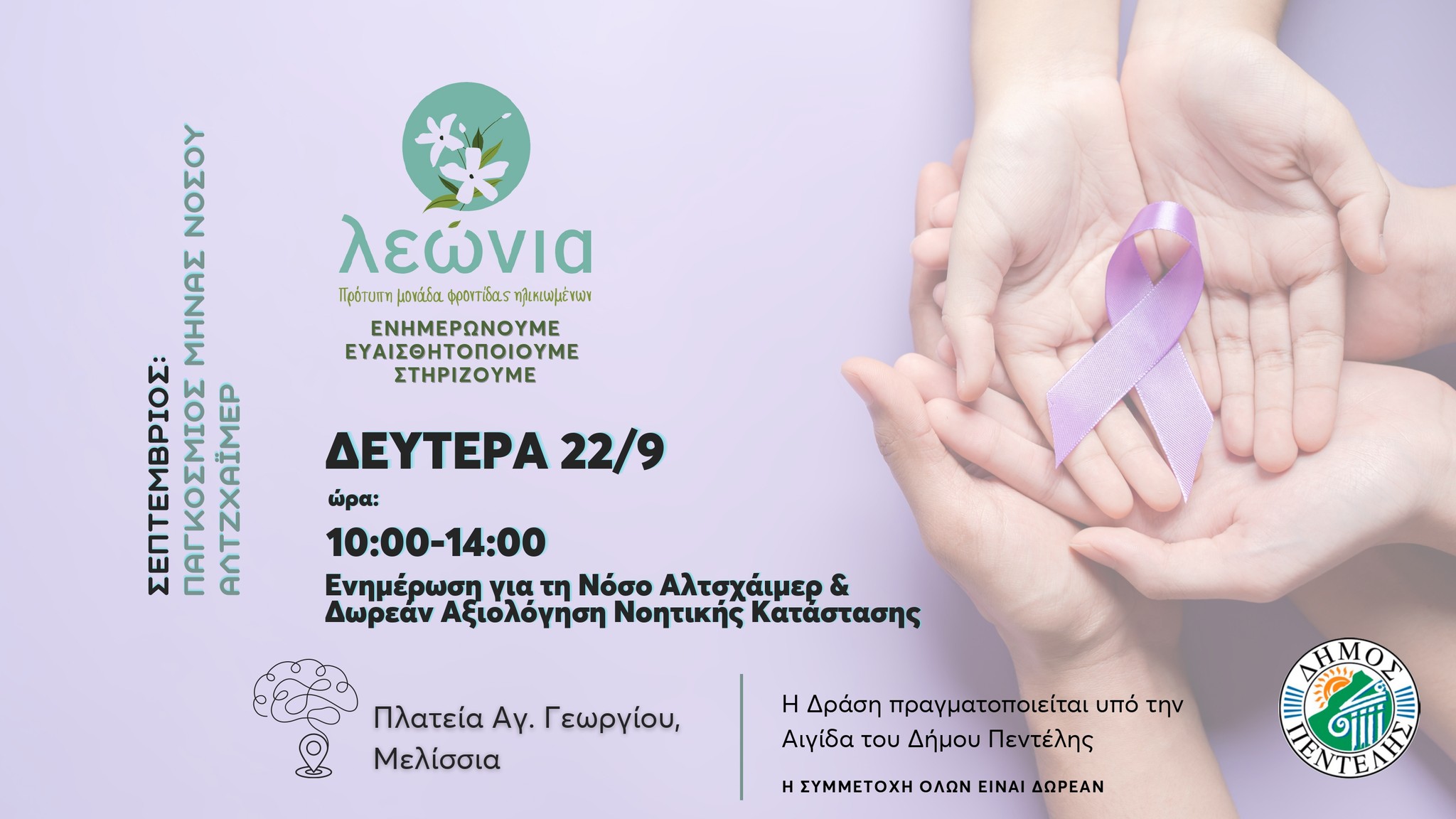 Με αφορμή την Παγκόσμια Ημέρα Νόσου Αλτσχάιμερ (21 Σεπτεμβρίου) ο Δήμος Πεντέλης στο πλαίσιο ενημέρωσης και ευαισθητοποίησης των δημοτών, διοργανώνει δράση ενημέρωσης και αξιολόγησης στην πλατεία Αγίου Γεωργίου.