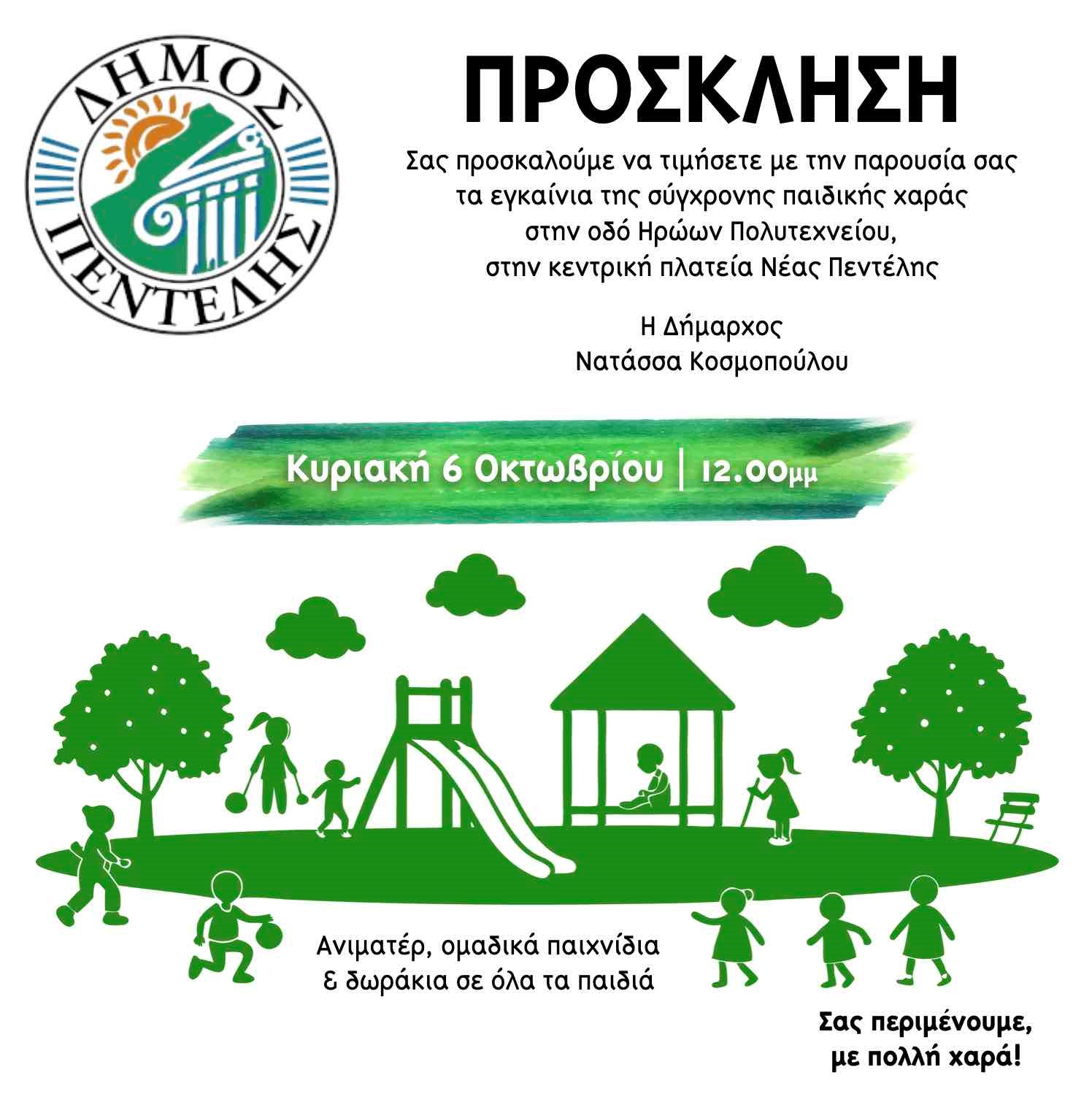 Όπως έκανε γνωστό ο Δήμος Πεντέλης, τα εγκαίνια της σύγχρονης παιδικής χαράς στην οδό Ηρώων Πολυτεχνείου στην κεντρική πλατεία Νέας Πεντέλης θα πραγματοποιηθούν την Κυριακή 6 Οκτωβρίου και ώρα 12.00.