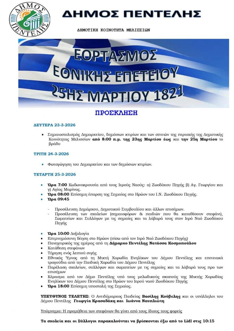 Το πρόγραμμα του εορτασμού της Εθνικής Επετείου της 25ης Μαρτίου και στις 3 Δημοτικές Κοινότητες  ανακοίνωσε ο Δήμος Πεντέλης.