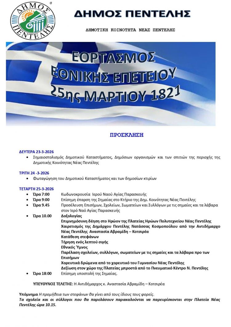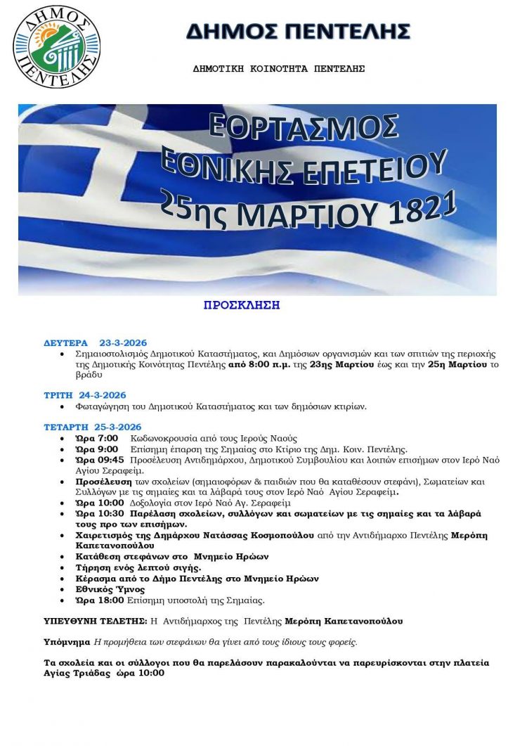 Tags: 25η ΜαρτίουΔΗΜΟΣ ΠΕΝΤΈΛΗΣΕθνική Επέτειοπρόγραμμα