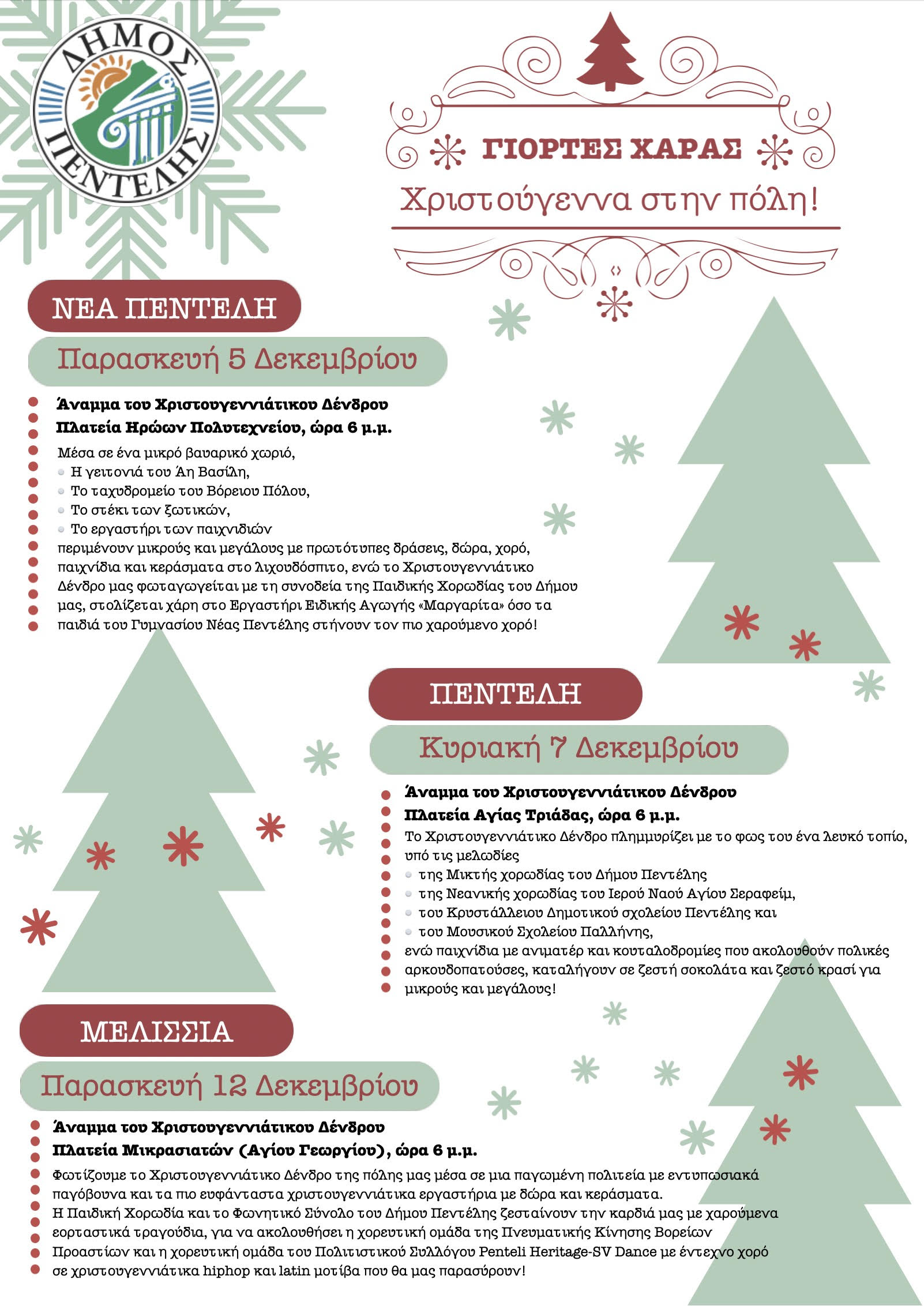 Την Κυριακή 7 Δεκεμβρίου (πλατεία Αγίας Τριάδας, 18.00) το Χριστουγεννιάτικο δέντρο θα ανάψει και στη ΔΚ Πεντέλης, ενώ οι εορταστικές εκδηλώσεις εν όψει της επίσημης έναρξης των Εορτών θα κορυφωθούν την Παρασκευή 12 Δεκεμβρίου με το άναμμα του Χριστουγεννιάτικου δέντρου στην πλατεία Μικρασιατών (Αγίου Γεωργίου) στα Μελίσσια.